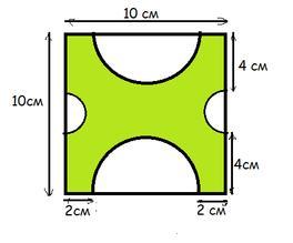 Розглянь малюнок. Це квадрат зі стороною 10см. Використовуючи данні на малюнку, знайди площу зафарбованої частини.
