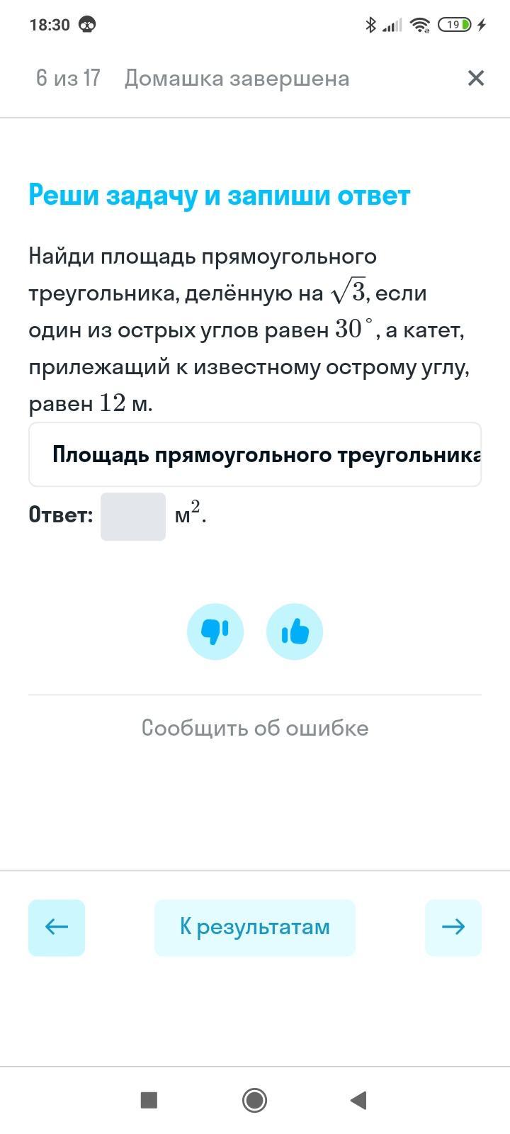 Найди площадь прямоугольного треугольника, деленного на √3,если один из острых углов равен 30°,а катет прилежащего к известному острому углу равен 12см.