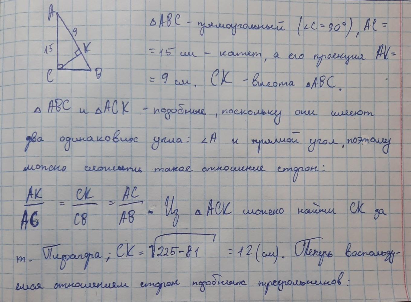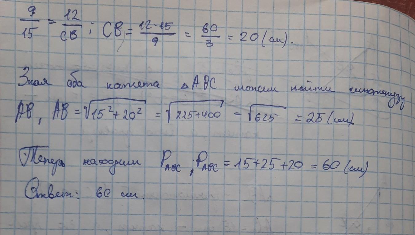 Катет прямоугольного треугольника равен 15 см, а его проекция на гипотенузу равна 9 см. Найти периметр треугольника.