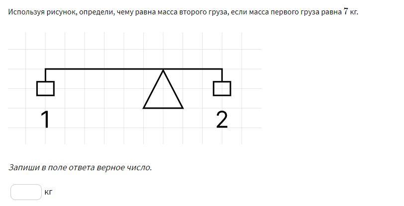 Используя рисунок, определи, чему равна масса второго груза, если масса первого груза равна 7 кг.
