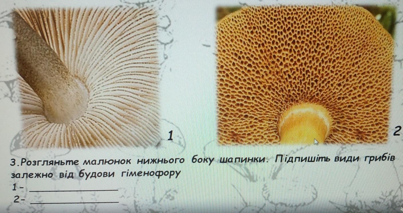 рогляньте малюнок нижнього боку шапинк.Підпишіть види грибів залежно від будови гіменофору