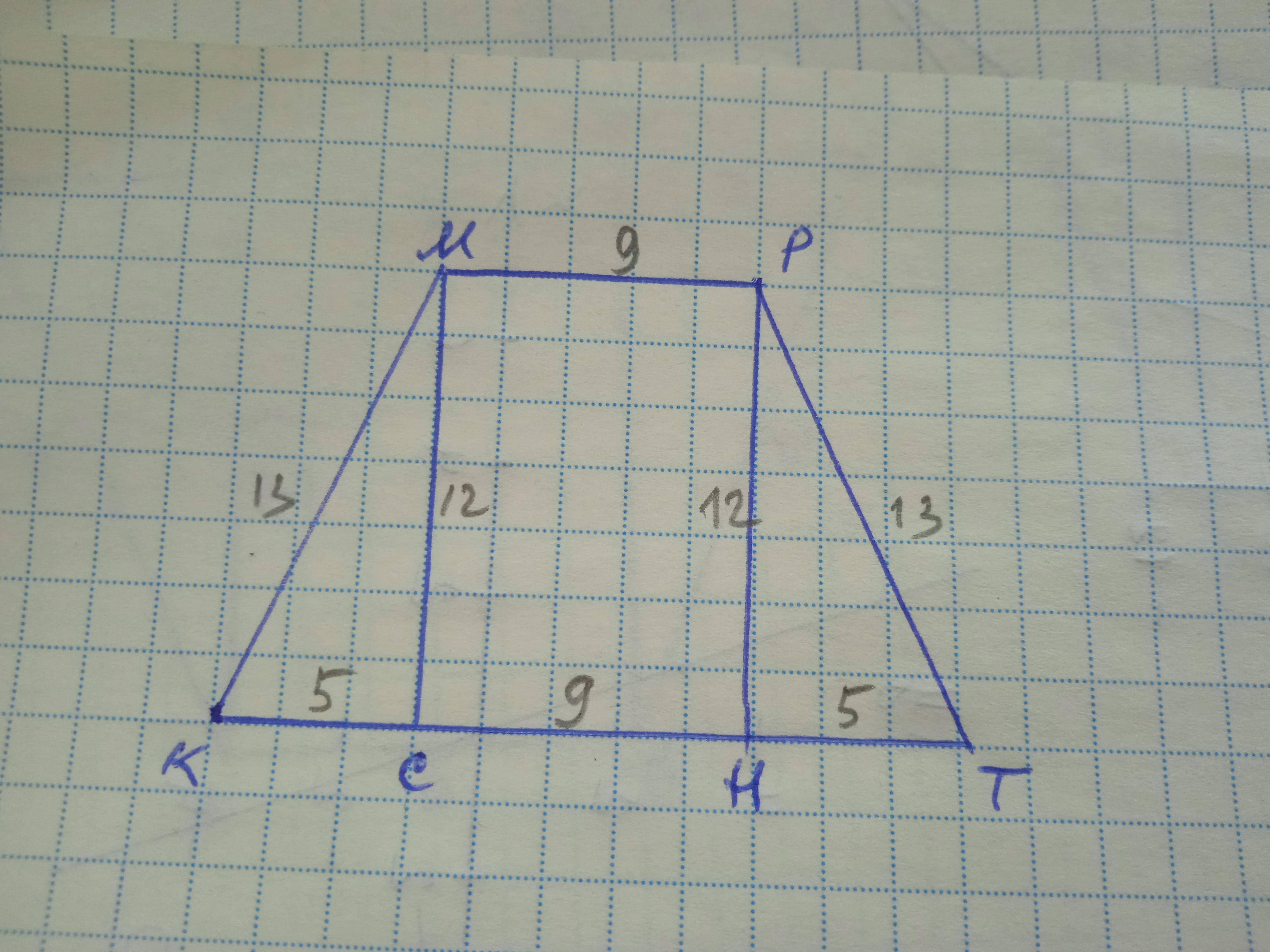 Дано: КМРТ - трапеція, МР=9 см, КТ=19 см, КМ=РТ=13 см. S - ?