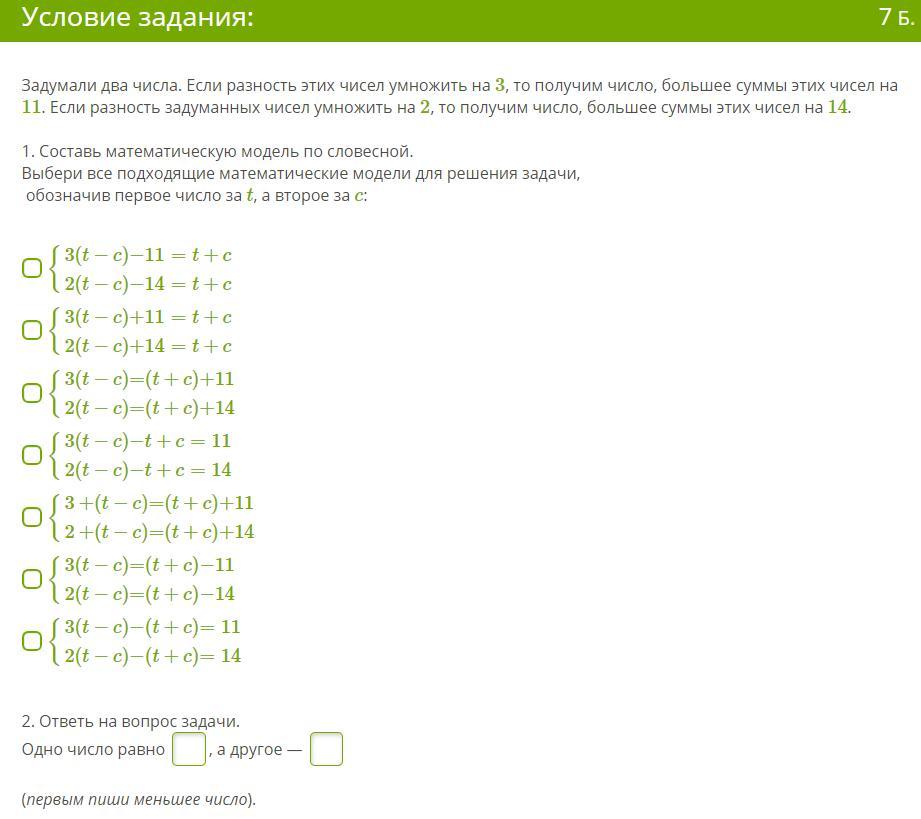 2) "Если разность задуманных чисел умножить на 2, то получим число, большее суммы этих чисел на 14": 2·(t-c)=(t+c)+14.
