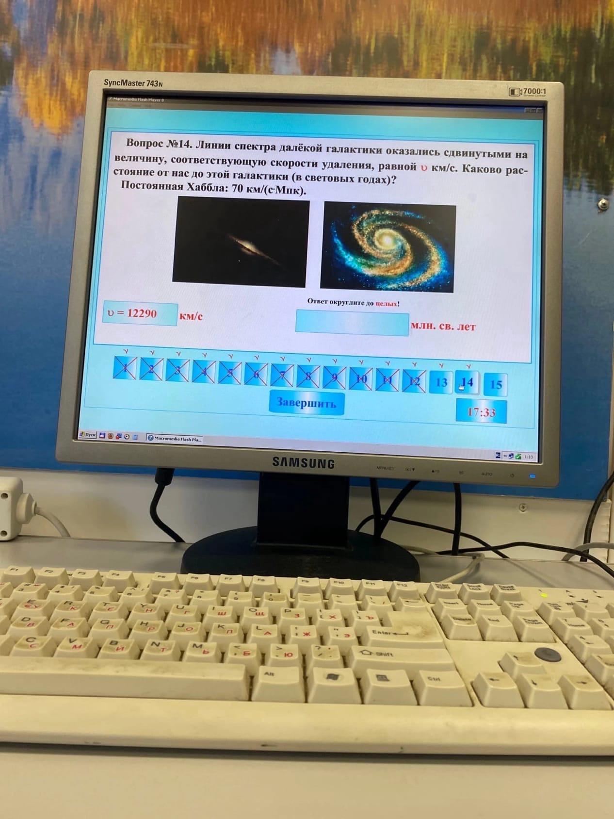 Линия спектра далёкой галактики оказались сдвинутыми за величину, соответствующую скорости удаления, равной нимходящему узлу(12290) км/с . каково расстояние от нас до этой галактики(в св.г) Постоянная хаббала:70км/(с*Мпк)