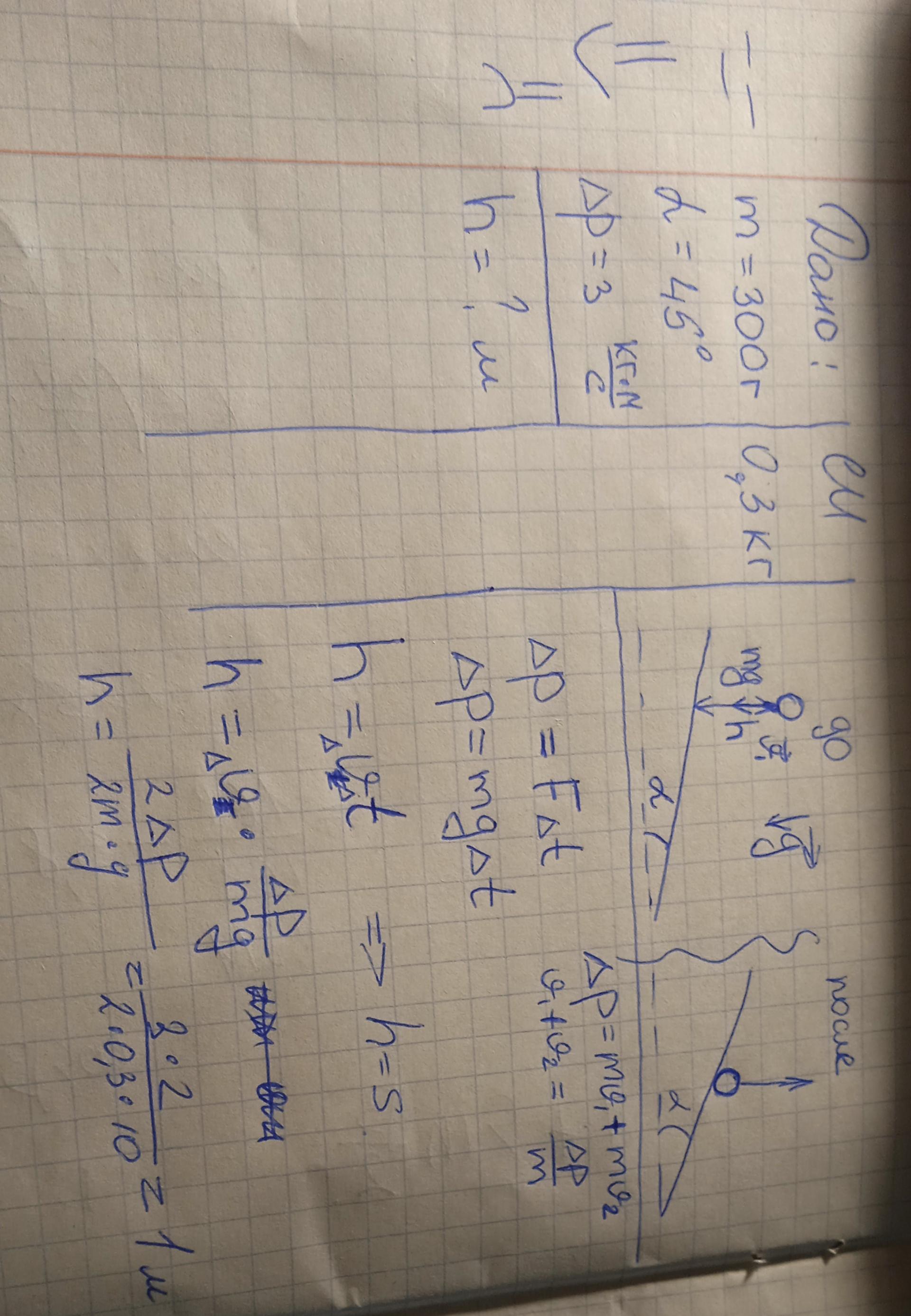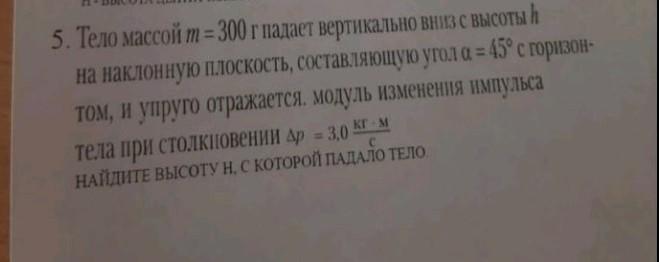 Тело массой 300 кг падает вертикально вниз с высоты h на наклонную плоскость составляющую угол a =45 с горизонтом и упруго отражается. Модуль измерения импульса 3кг ×м/ с. Найдите высоту с которой падает тело