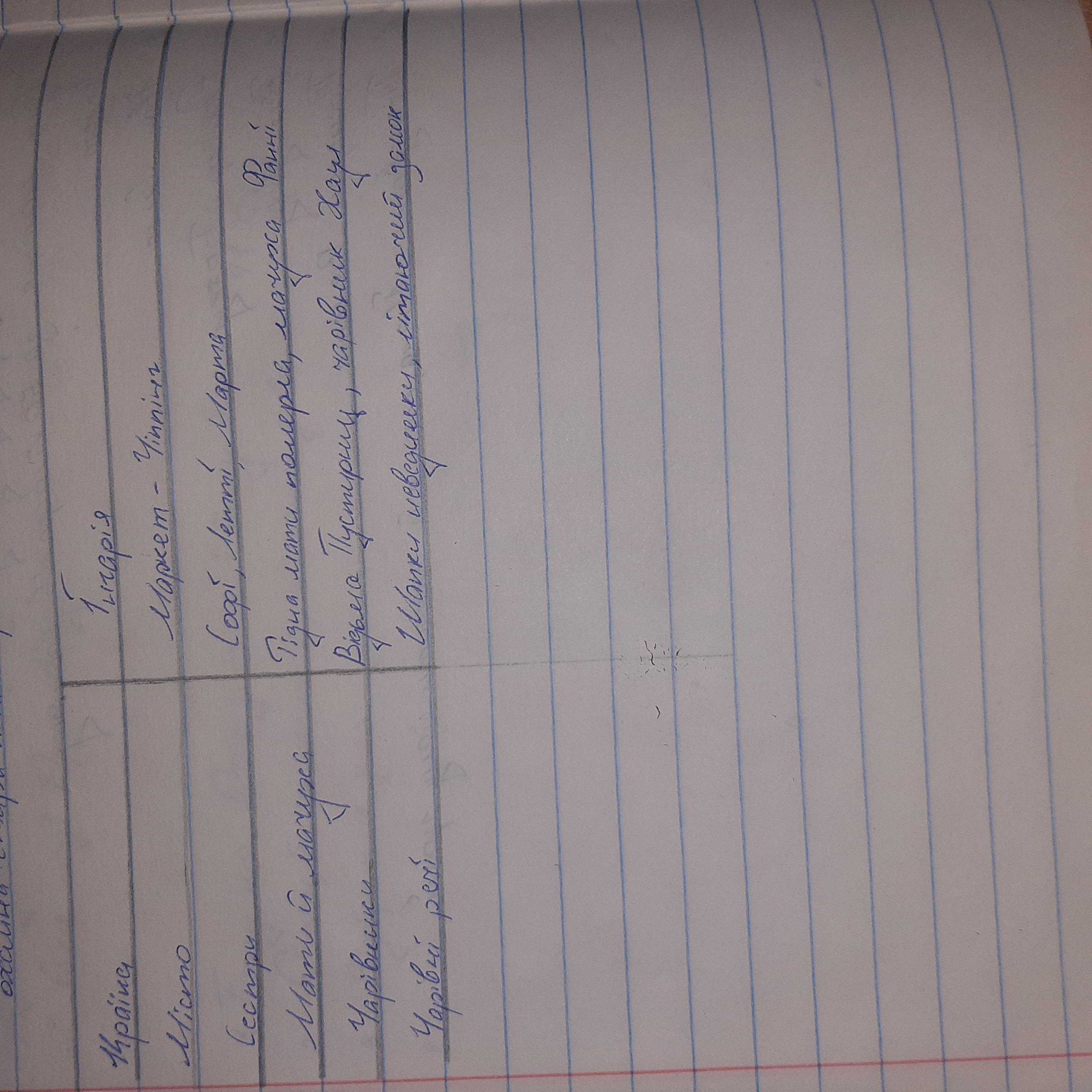 Країна,місто,сестри,мати й мачуха,чарівники,чарівні речі.Писати планом у стовпчик.Наприклад:1.Країна-Інгарія.2.Місто,і так далі......