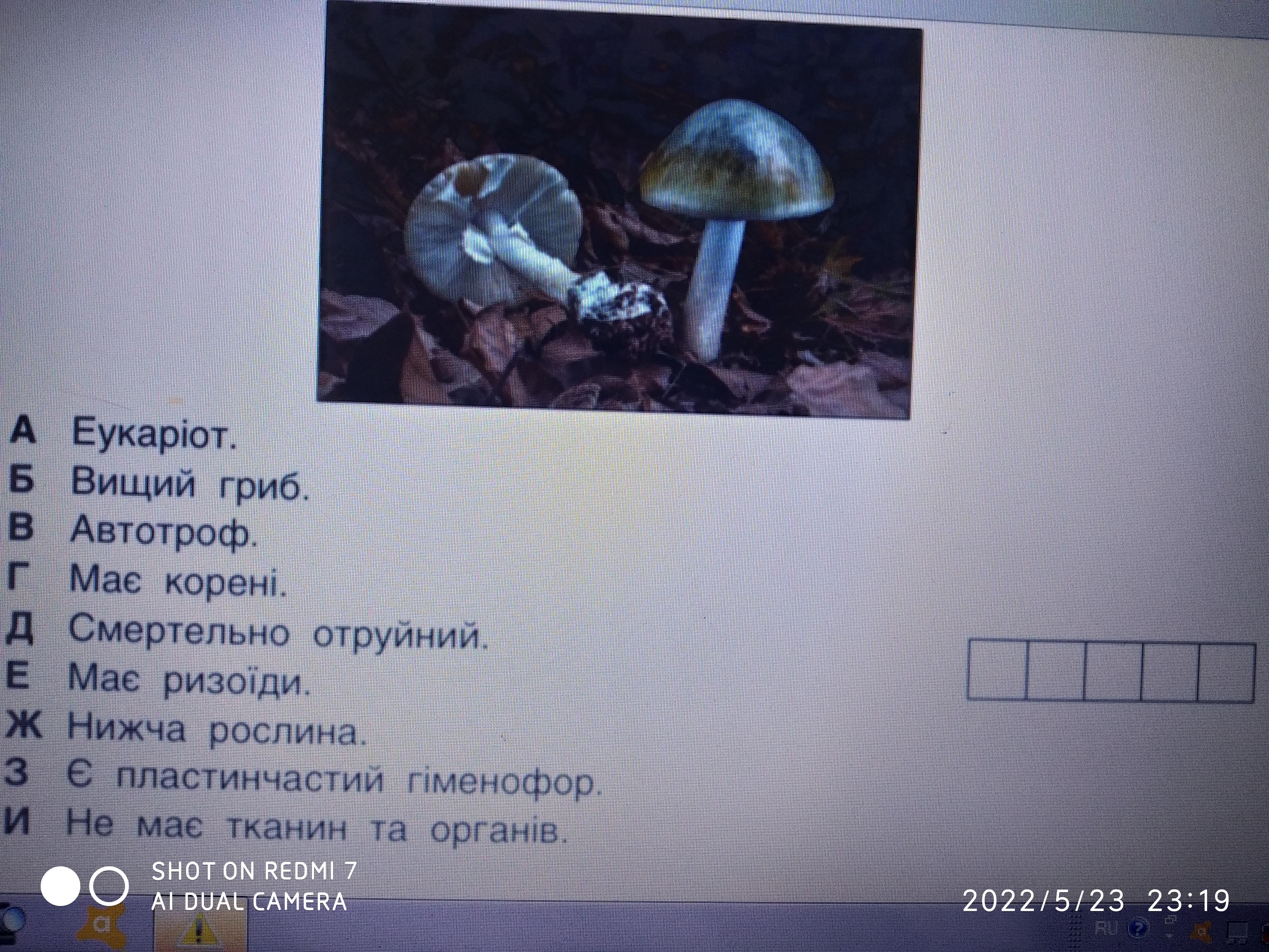 Упиши в клітинки букви,якими позначено властивості, характерні для зображеного організму.