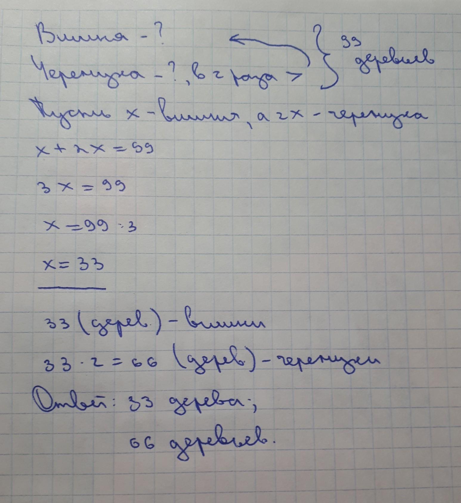 Ответ: в саду было 33 дерева черёмухи и 66 деревьев вишен.