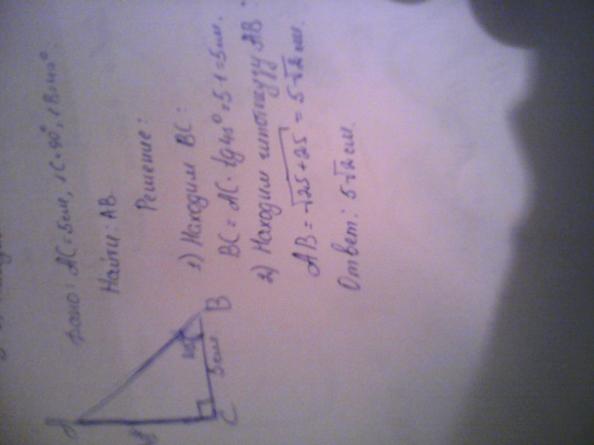 как найти гипотинузу прямоугольного треугольника если сторона равна 5 см, угол равен 45 градусов, и угол равен 90 градусов