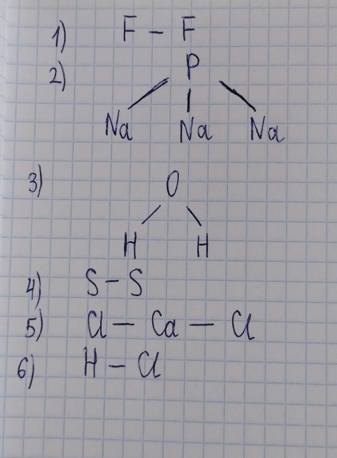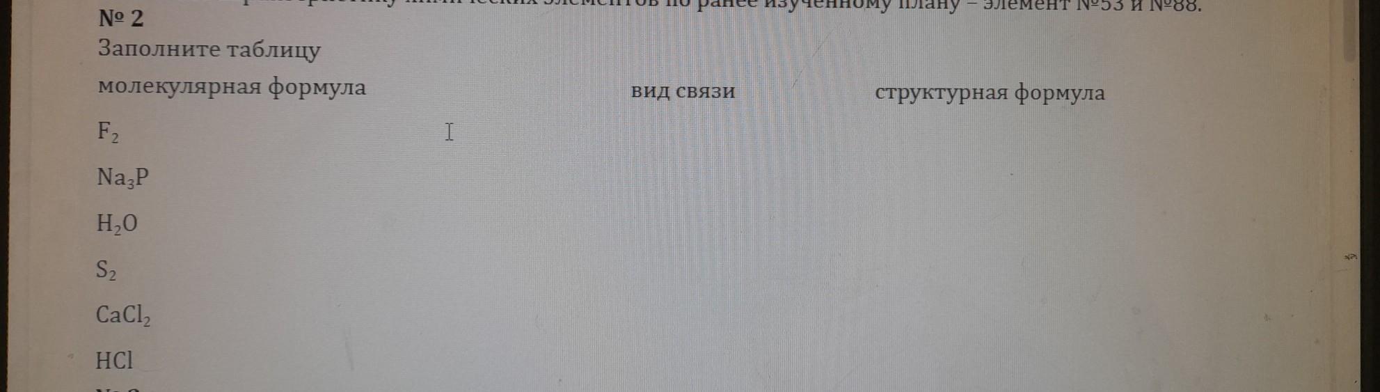 Заполните таблицу: молекулярная форма вид связи структурная формула F2 Na3P H2O S2 CaCl2 HCl