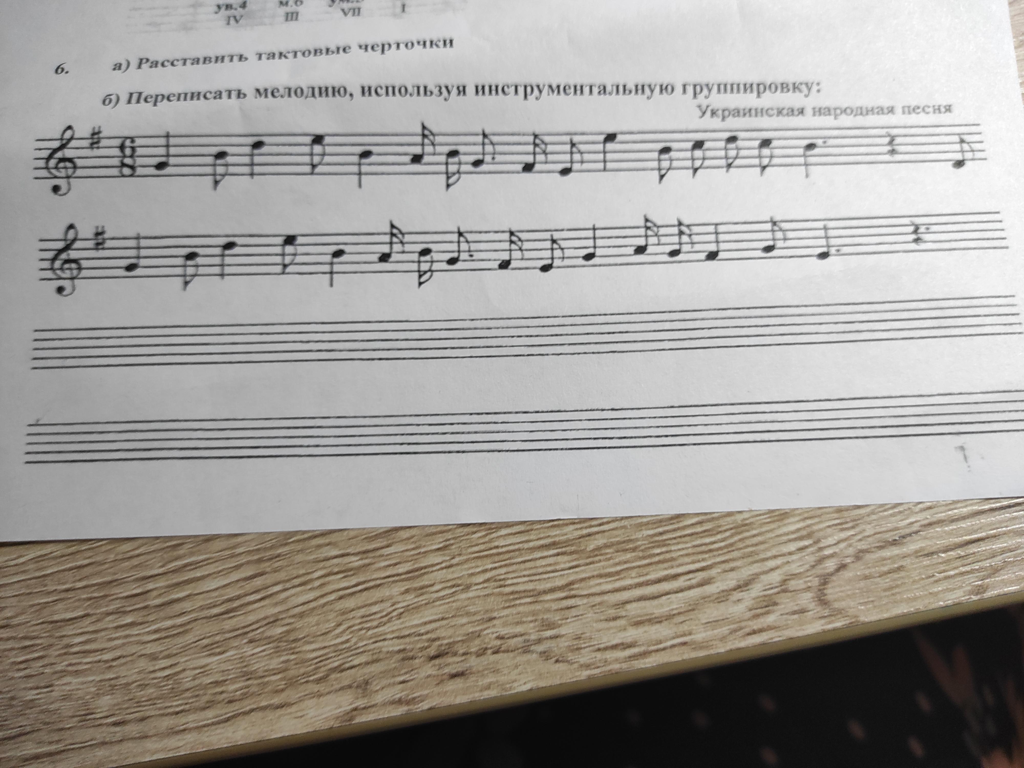 Помогите пожалуйста, расставить тактовые чёрточки и переписать переписать мелодию, используя инструментальную группировку