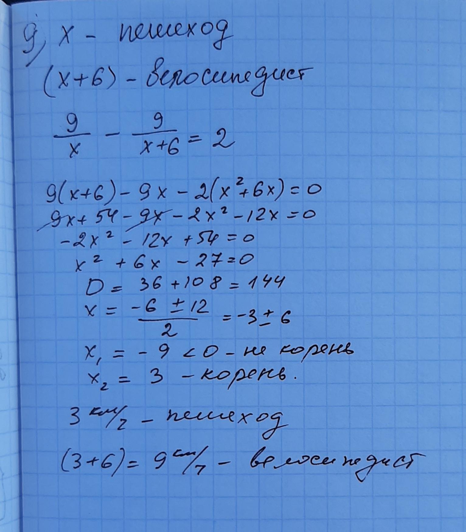 9.На шлях, що дорівнює 9 км, велосипедист витратив часу на 2 год менше, ніж пішохід, оскільки за 1 год проїжджав на 6 км більше, ніж проходив пішо