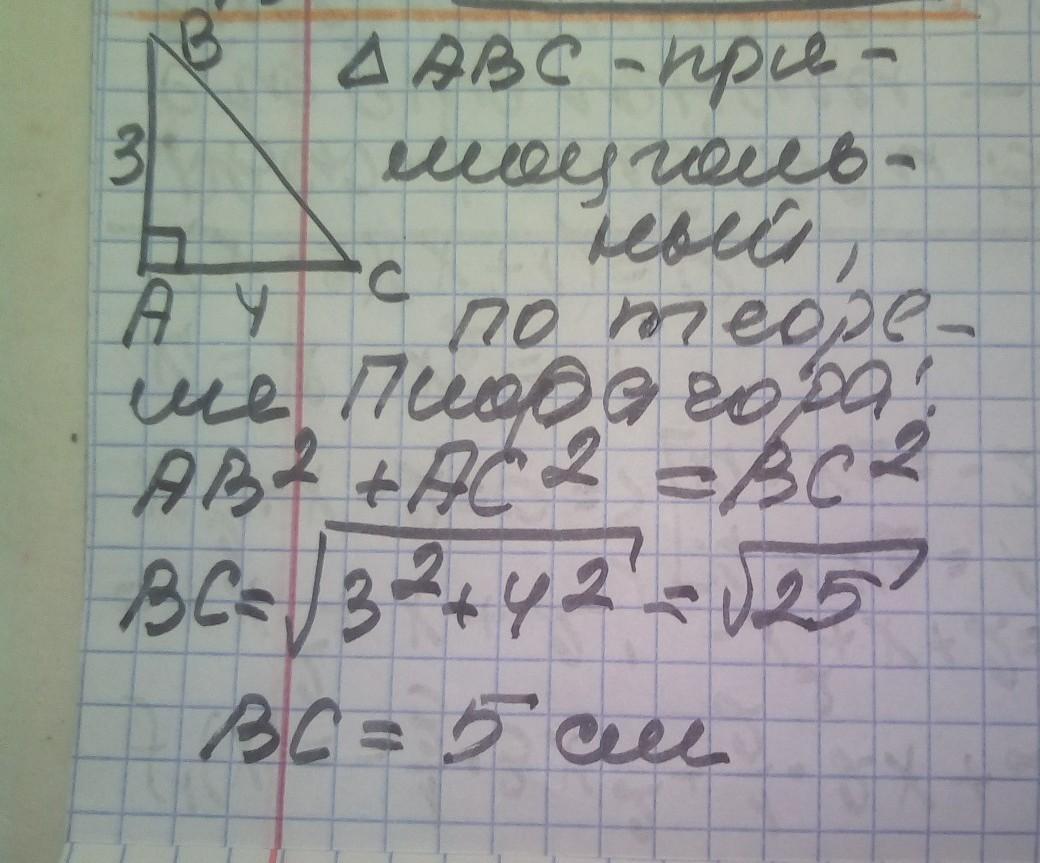 знайдіть сторону ВС трикутника АВС, кут а = 90°, якщо АВ=3см , АС=4 см