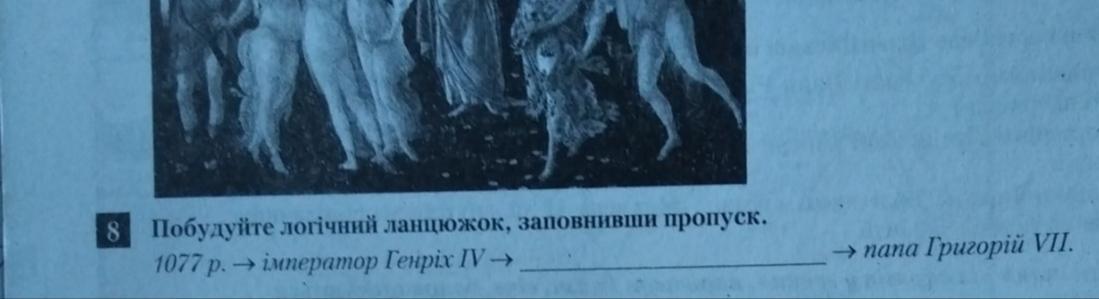 1077 → Імператор Геріх IV → інвеститура → папа Григорій VІІ.
