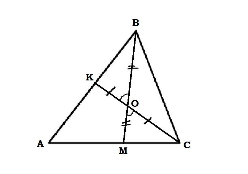 на стороне АС и АВ треугольника АВС отметили точки М и К соответственно BM и СК пересекаются в точке О так ,что ВО = ОМ и КО = ОС.Докажите равенство любых двух образовавшихся треугольников