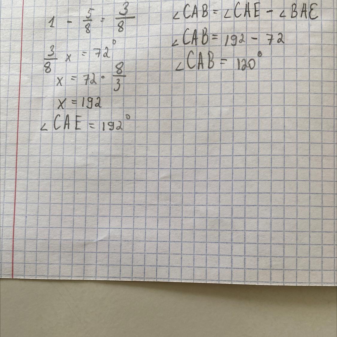 Угол CAE разделен лучом АВ на два угла CAB и ВАЕ. Угол ВАЕ равен 72 ° и составляет 5/8 угла CAE: