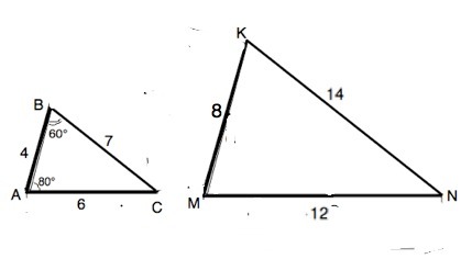 В треугольнике ABC-AB=4 см,BC=7 см,AC=6 см,а в треуголььнике MKN-MK=8 см,MN=12 см,KN=14 cм.