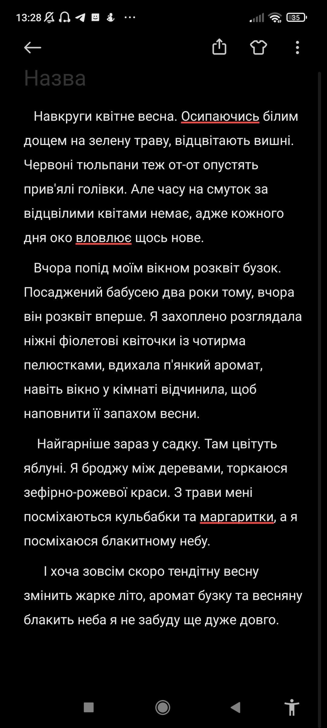 І хоча зовсім скоро тендітну весну змінить жарке літо, аромат бузку та весняну блакить неба я не забуду ще дуже довго. Відповідь: Навкруги квітне весна. Осипаючись білим дощем на зелену траву, відцвітають вишні. Червоні тюльпани теж от-от опустять прив'ялі голівки. Але часу на смуток за відцвілими квітами немає, адже кожного дня око вловлює щось нове.