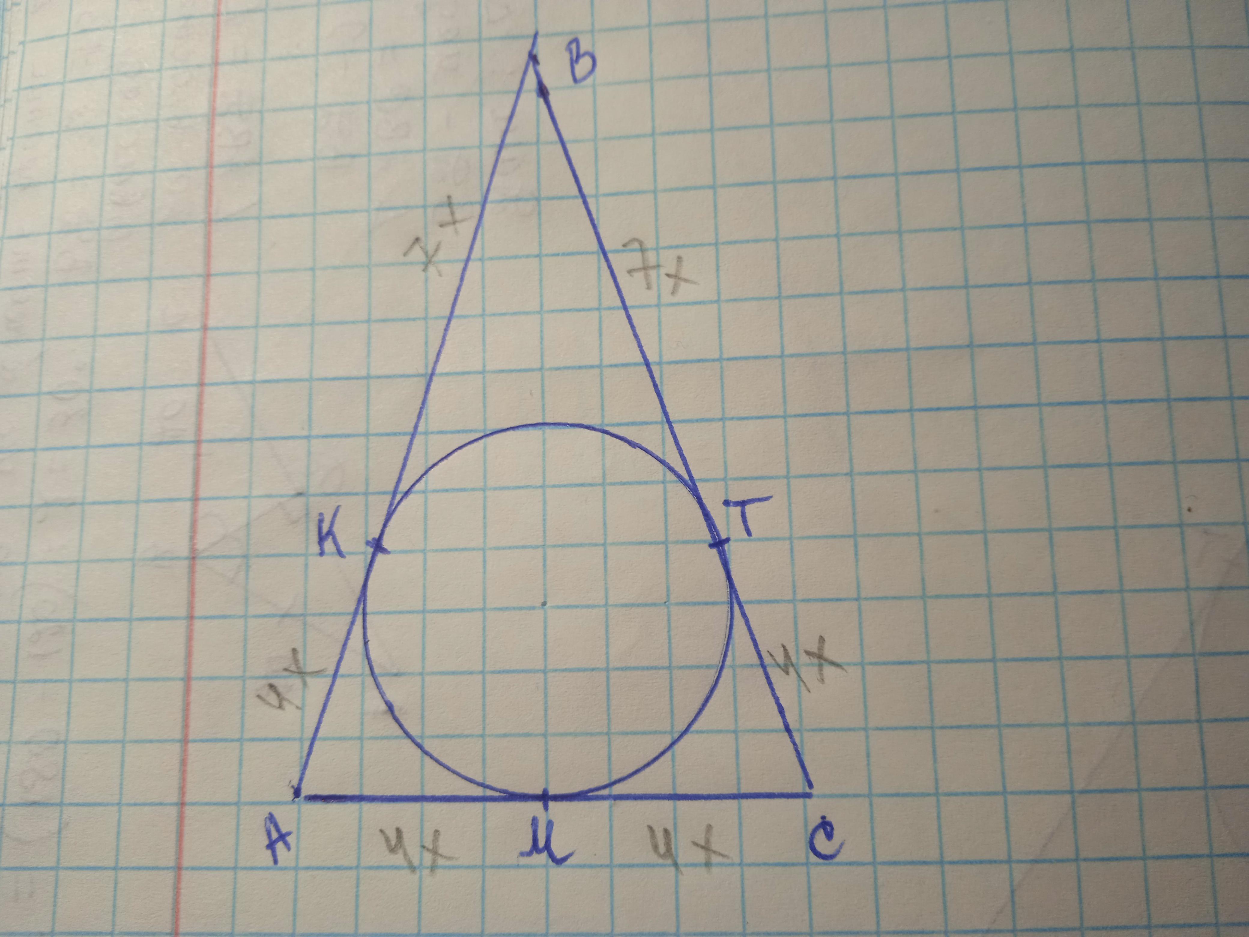 АК=АМ=4х см; СМ=СТ=4х см; ВК=ВТ=7х см.