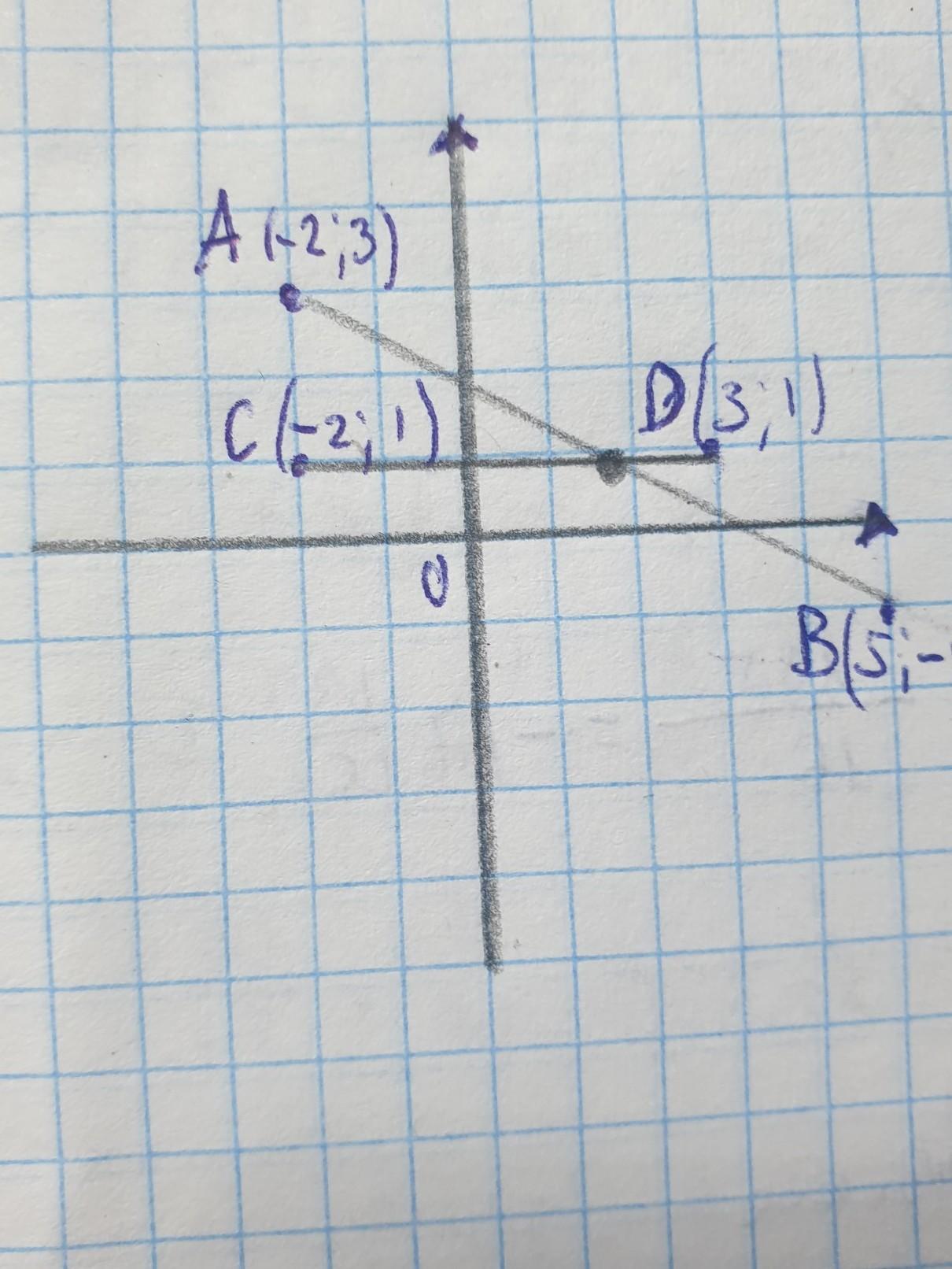 Побудуйте на координатній площині точки А(-2;3), В(5;-1), С(-2;1), D(3;1). Знайдіть координати точки перетину відрізків АВ і СD