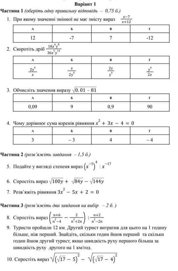 СРОЧНОООО ОСТАННІ ЗАВДАННЯ Рiчна контрольна робота з алгебри 8 клас Варiант 1 Частина 1 (оберіть одну правильну відповідь - 0,75 б.) 1. При якому значеннi змiнноï не має змісту вираз X-7 x+12 Б В Г 12 7 -12 68 2. Скоротіть дріб 18x y 36x'у' A Б B r 2у Х 2x 2x 3. Обчисліть значення виразу 0.01 .81 Б B Г 0,09 9 0,9 90 4. Чому дорівнює сума коренів рівняння x² + 3x - 4 = 0 A Б В . 3 - 3 4 -4 Частина 2 (розв'яжіть завдання - 1,5 б.) 5. Подайте у вигляді степеня вираз 6. Спростіть вираз √100 + 84 - 144y 7. Розв'яжіть рiвняння 3x² 5x + 2 = 0 - Частина 3 (розв'яжіть два завдання на вибір - 2 б.) n+6 2 n+2 8. Спростіть вираз n²-4 n'+2n n-2n 9. Туристи пройшли 12 км. Другий турист витратив для цього на 1 годину бiльше, ніж перший. Знайдіть, скільки годин йшов перший та скільки годин йшов другий турист, якщо швидкість руху першого більша за швидкість руху другого на 1 км/год. 10. Спростіть вираз √(√/17 – 5)² - √(/17 - 4)² 5.14