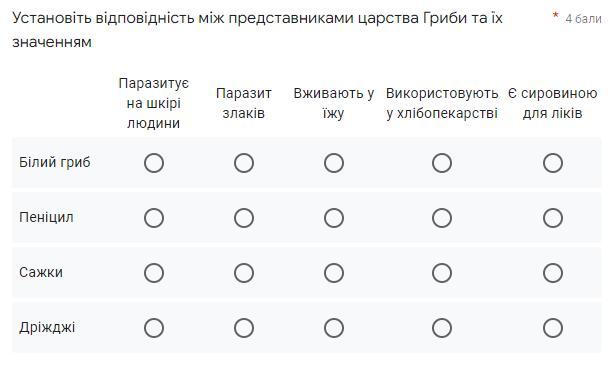 Білий гриб – вживають у їжу, Сажки – Паразит злаків, Пеніцил – сировина для ліків, Дріжджі – хлібопекарство