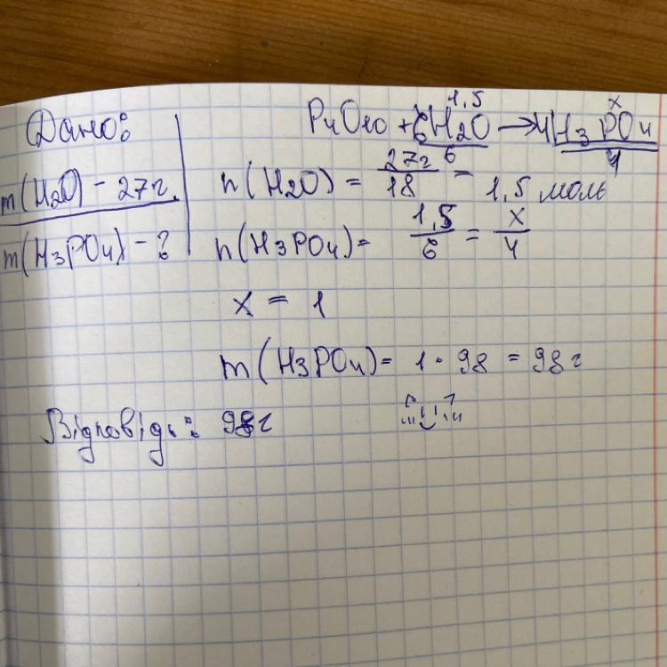 З фосфор (V) оксидом прореагувала вода масою 27 г. Яка маса ортофосфатної кислоти, що утворилося?