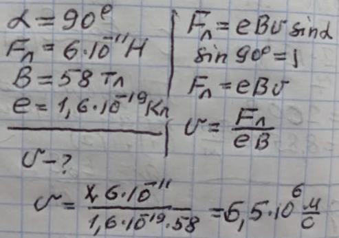 На протон, що влетів в магнітне поле перпендикулярно до лiнiй магнітної індукції діє сила Лоренца 6*10^(-11) Н. Індукцiя поля дорівнює 58 Тл. Визначте швидкість протона.