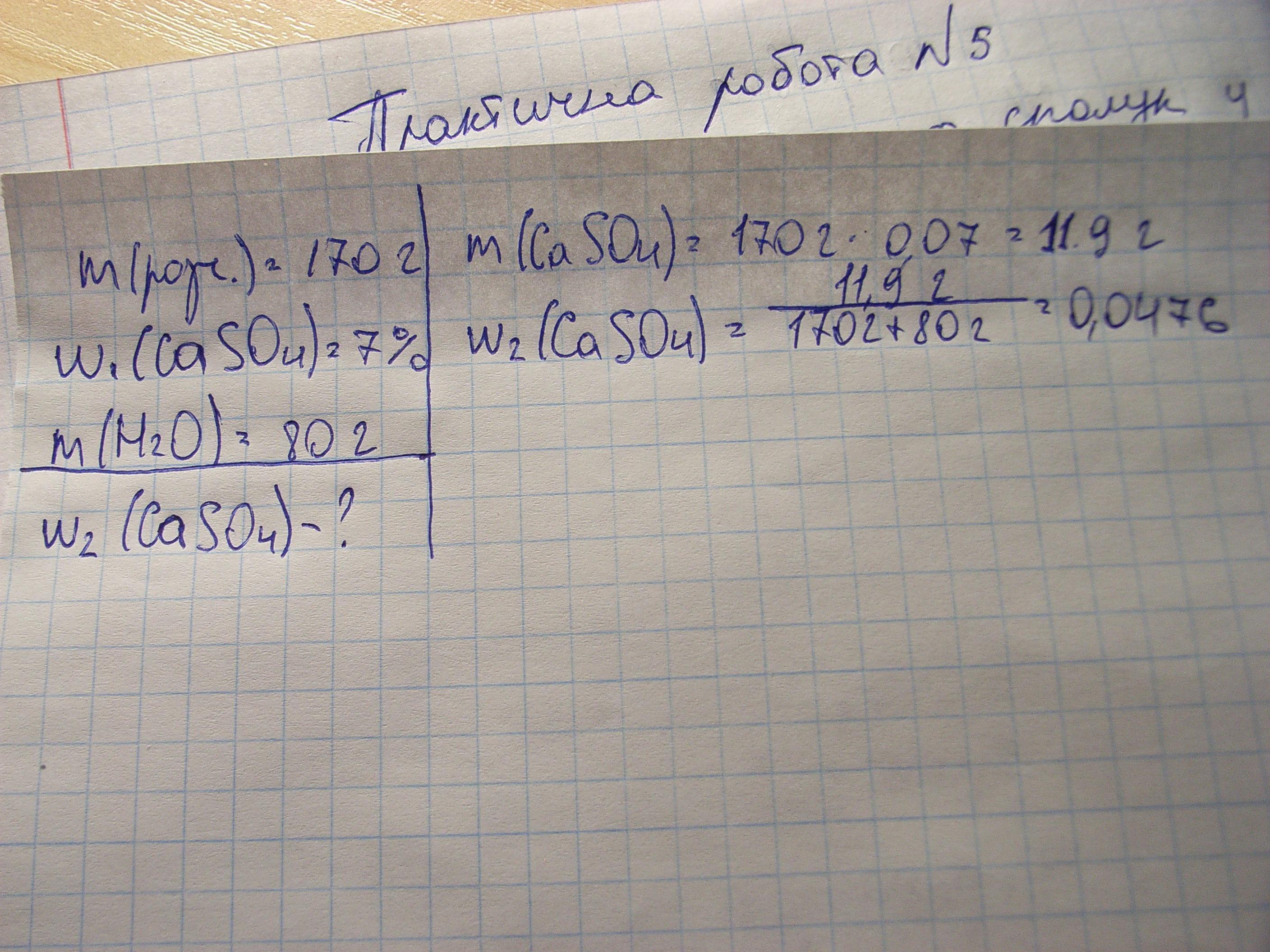 Обчисліть масову частку кальцій сульфату (СаSO4) в новому розчині, якщо до його розчину масою 170г з масовою часткою 7% долили воду масою 80г. (У відповіді вкажіть число без відсотків, наприклад: 5,5)