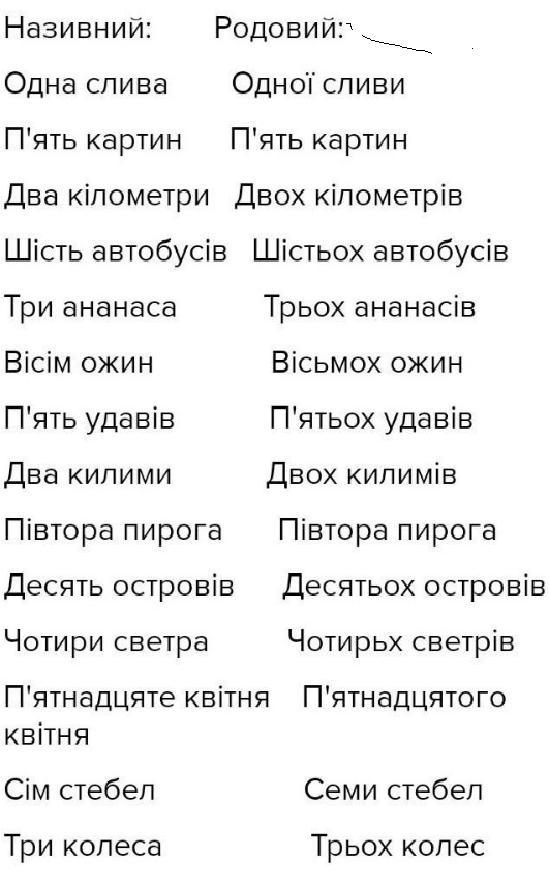 Запишіть послідовно, розкриваючи дужки, словосполучення у дві колонки: а) у яких іменники вживаємо в називному відмінку; б) а) у яких іменники вживаємо в родовому відмінку Одна(слива), одна друга(узвіз), п`ять (картина), два(кілометр),шість (автобус), три (ананас), вісім(ожина), п`ять(удав), два (килим), півтора(пиріг), десять(острів), чотири(светр), п`ятнадцяте(квітень), вісім (лящ), сім(стебло), три(колесо), два (смайлик), дев`ять(колір), чотири(будинок).