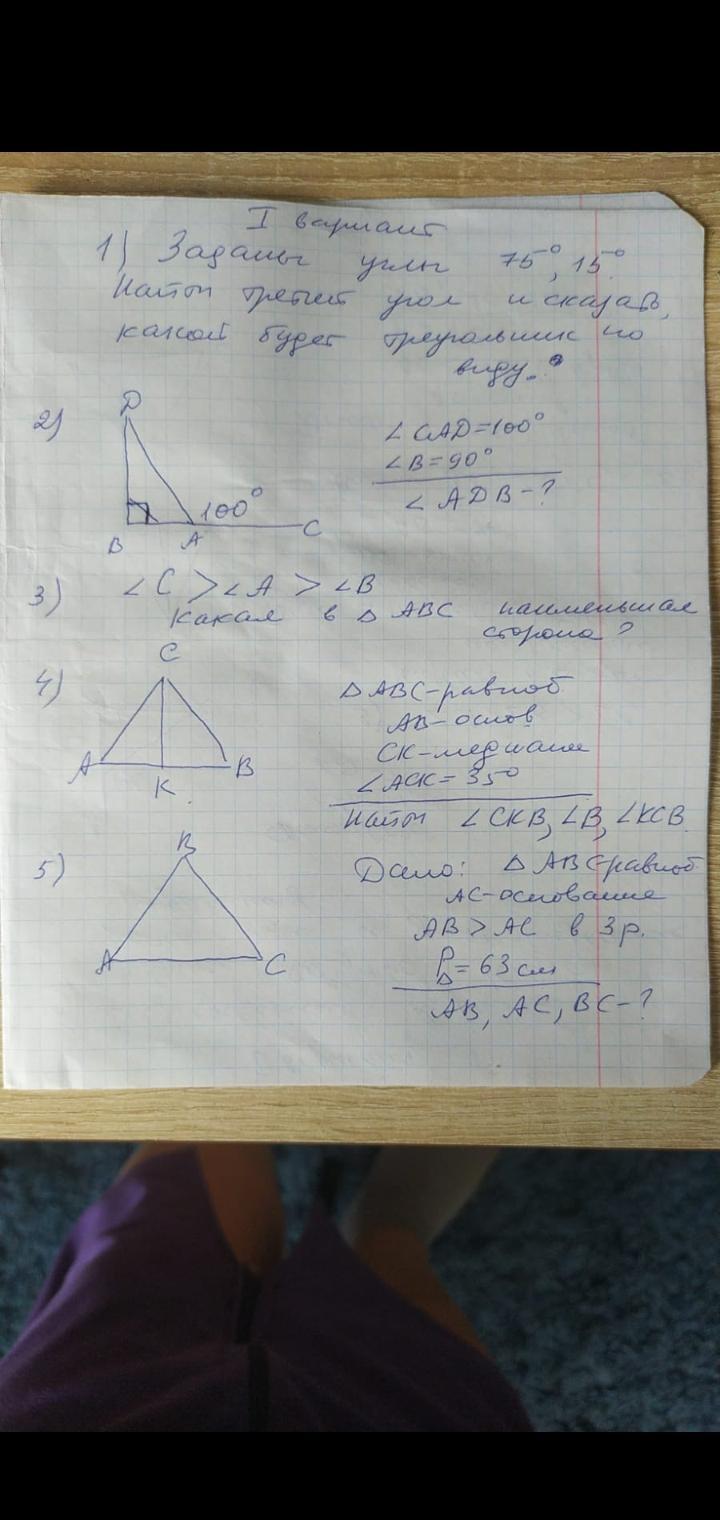 1) по свойству о сумме углов треугольника его третий угол равен 180°-75°-15°=90°- прямой угол