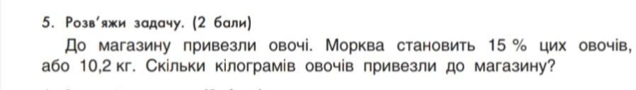 До магазину привезли овочі. Морква становить 15% цих овочів, або 10,2 кг. Скільки кілограмів овочів привезли до магазину?