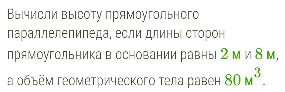 Вычисли высоту прямоугольного параллелепипеда, если длины сторон прямоугольника в основании равны 2 м и 8 м, а объём геометрического тела равен 80 м3.