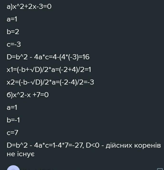 2) D=b²-4ac, D= (-1) ²-4×1×7=1-28=-29<0, тому кореней нема