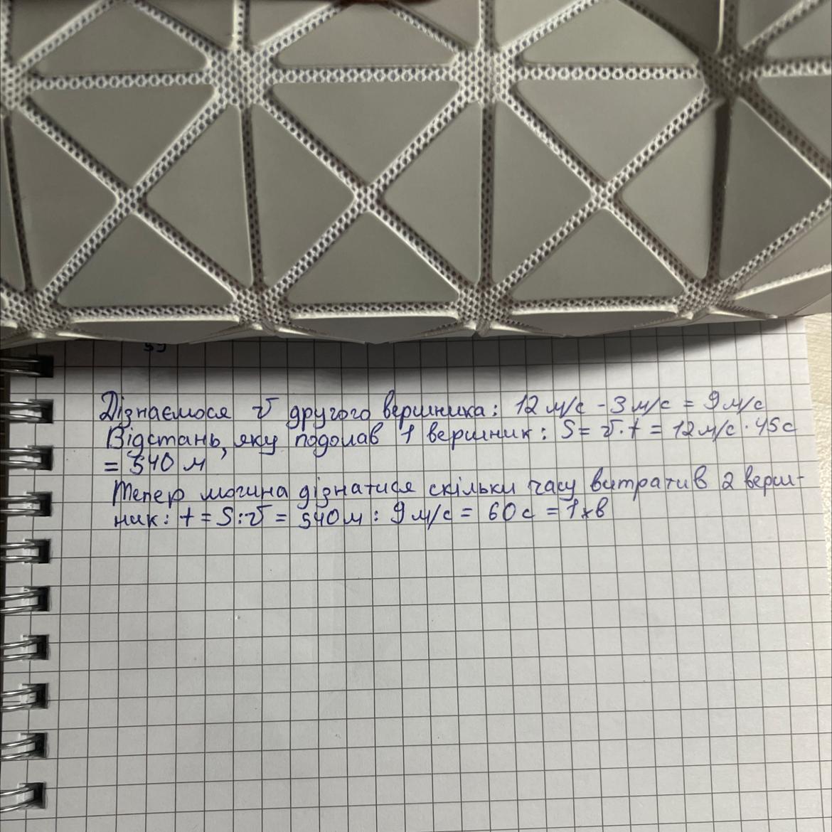 Два вершники одночасно вирушили іподромом. Швидкість 1 вершника 12 м/с а другого на 3 м/с менша. Скільки часу витратив 2 вершник якщо перший подолав цю відстань за 45 с.