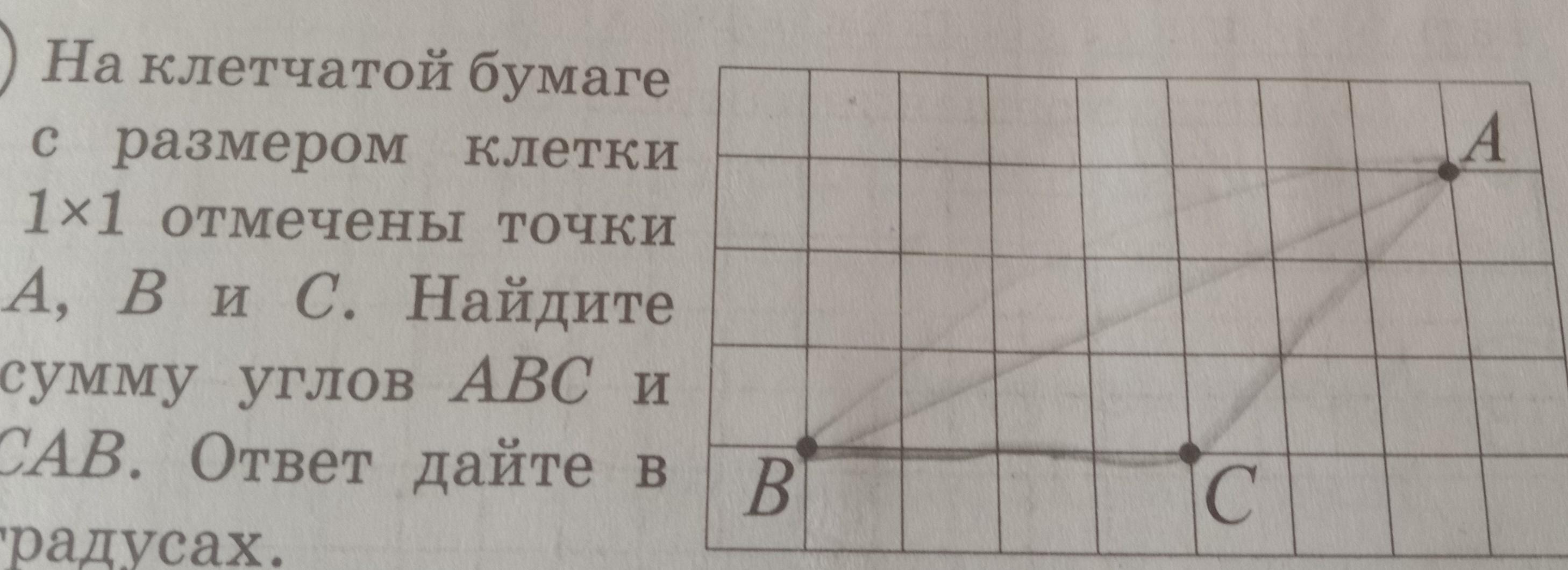 На клетчатой бумаге с размером клетки 1×1 отмечены точки A, B и C. Найдите сумму углов ABC и CAB. Ответ дайте в градусах.