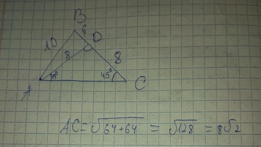 У трикутнику АВС кут С дорівнює 45 градусів , АВ дорівнює 10 см, висота АD ділить сторону СВ на відрізни СD дорівнює 8 см і DB дорівнює 6 см . Знайдіть сторону паралелограма.