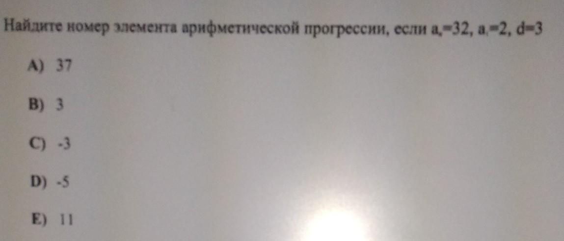 Найдите номер элемента арифметической прогрессии, если а n=32, a1=2, d=3 a) 37 в) 3 с) -3 d) -5 e) 11 Напишите только ответ