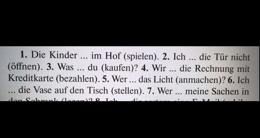 1. Die Kinder haben im Hof gespielt. 2. ich habe die Tür nicht geöffnet. 3. was hast du gekauft? 4. wir haben die Rechnung mit kreditkarte bezahlt. 5.wer hat das Licht angemacht? 6. ich habe die Vase auf den Tisch gestellt.