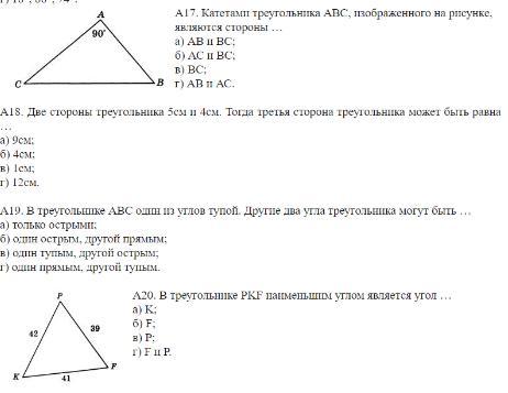 А19) вариант а) т.к. тупой угол начинается от 91 градуса и до 178. и если взять самый минимум: 180-91=89 градусов, и это сумм двух оставшихся углов, следовательно они не могут быть ни тупыми ни прямыми.