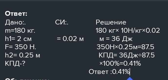 Вычислите КПД рычага, с помощью которого груз массой 180 кг равномерно подняли на высоту 2 см. При этом к длинному плечу рычага была приложена сила 350 Н, а точка приложения силы опустилась на 0,25 м.