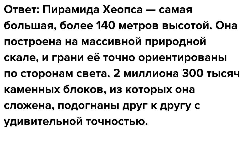Ответ: Пирамида Хеопса — самая большая, более 140 метров высотой. Она построена на массивной природной скале, и грани её точно ориентированы по сторонам света. 2 миллиона 300 тысяч каменных блоков, из которых она сложена, подогнаны друг к другу с удивительной точностью.