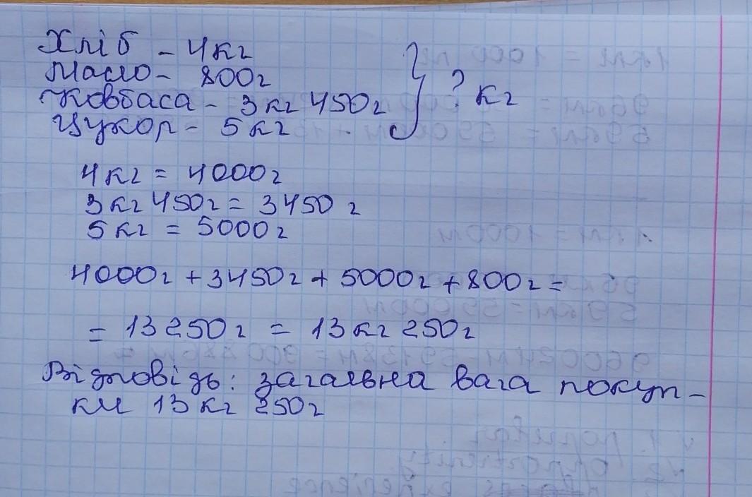 У крамниці купили 4 кг хліба, 800 г масла, 3 кг 450 г ковбаси і 5 кг цукру. Визначте загальну вагу покупки. Запишіть розрахунки.