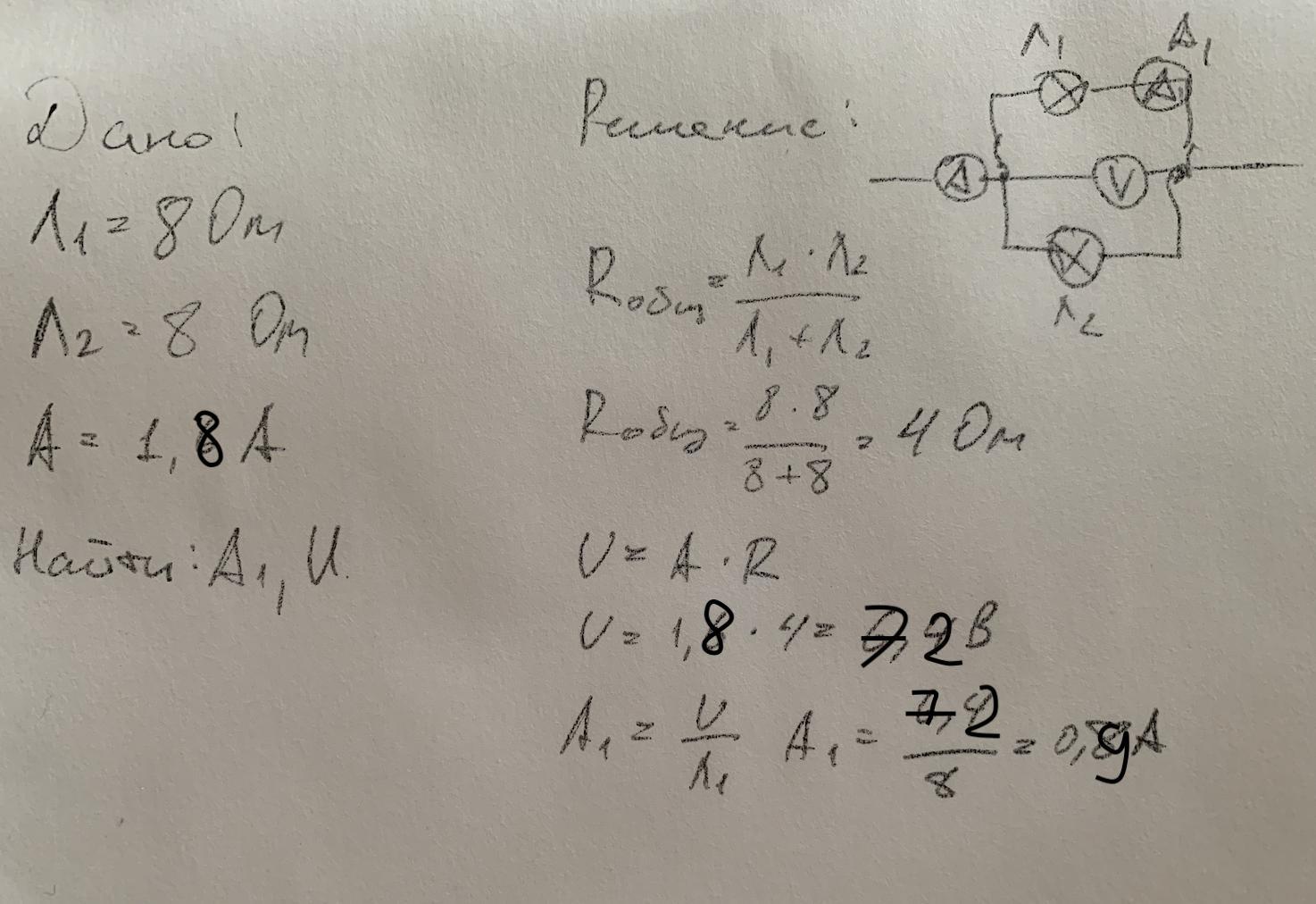 Находим ток через Л1 - А1=U/Л1 А1=7,2/8=0,9А