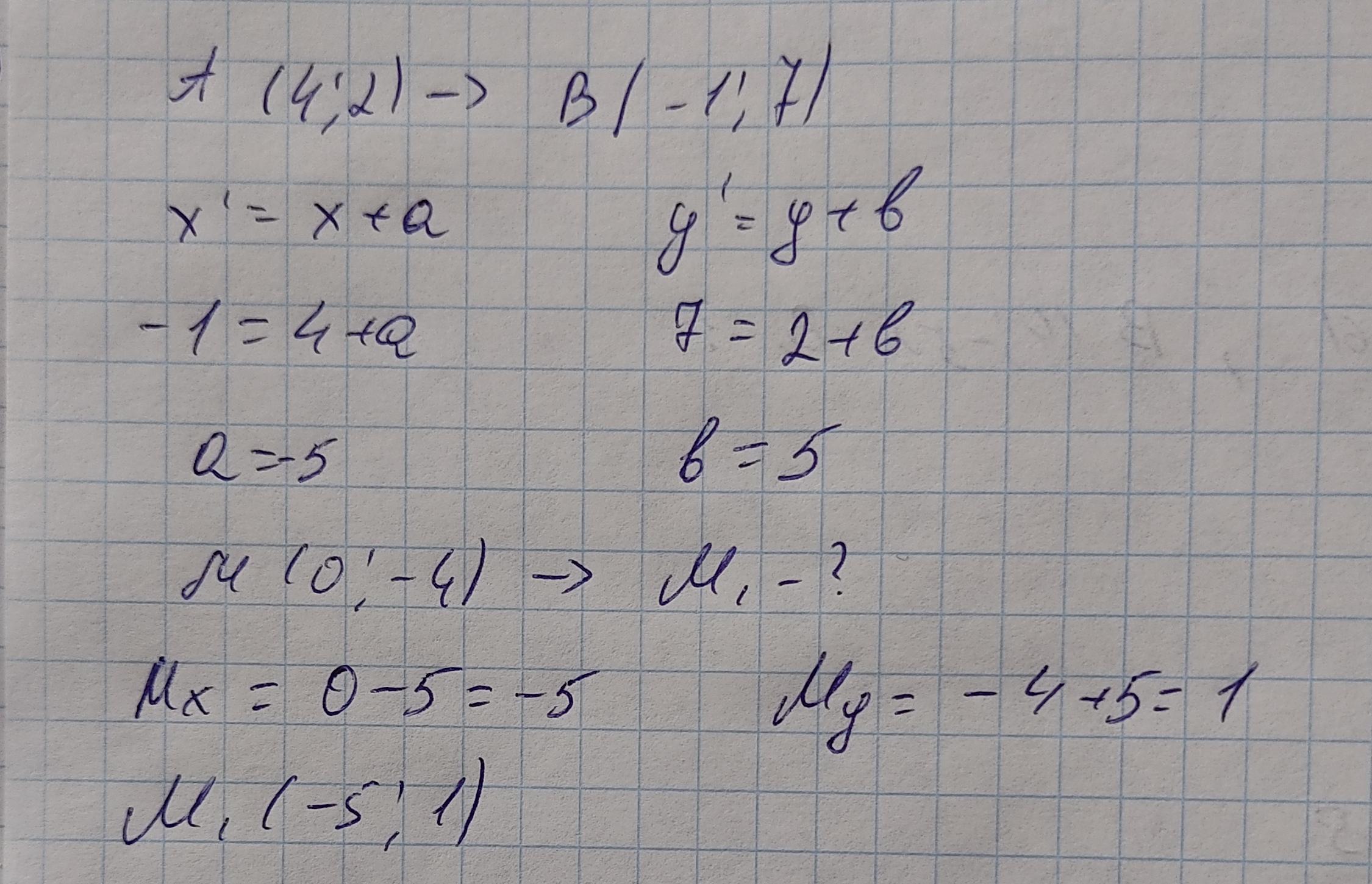 При паралельному перенесенні образом точки A(4; -2) є точка B(-1; 7). Яка точка є образом точки М(0; -4) при цьому паралельному перенесенні?