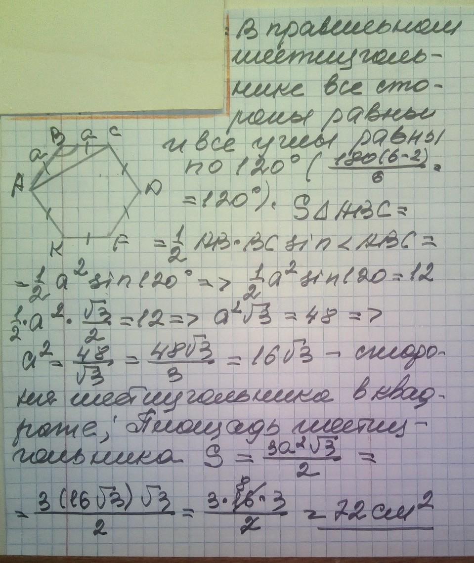 Знайти площу правильного шестикутника ABCDFK якщо площа трикутника ABC дорівнює 12см^2. С дано!