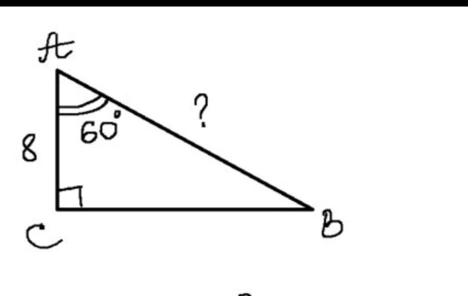 Известна сторона и угол. Чтобы найти гипотенузу АВ, надо АС умножить на косинус А: АВ=АС•cos 60=8•1/2=4