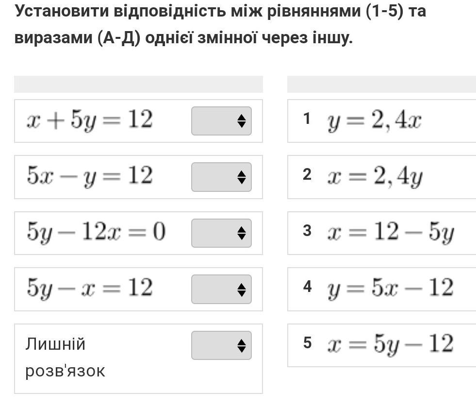 Установити відповідність між рівняннями (1-5) та виразами (А-Д) однієї змінної через іншу.