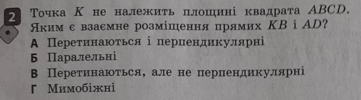 Точка K не принадлежит к плоскости квадрата ABCD. Каково взаимное размещение прямых KB и AD? (ЗАДАНИЕ НА ФОТО + ОТВЕТЫ!!)