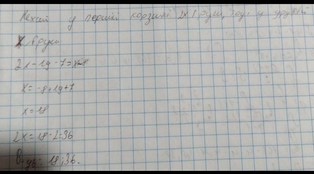 В одній корзині було у 2 рази більше груш, ніж у другій. Після того, як з першої корзини взяли 19 груш, а з другої – 8, то у другій корзині залишилося на 7 груш менше, ніж у першій. Скільки груш було у кожній корзині спочатку